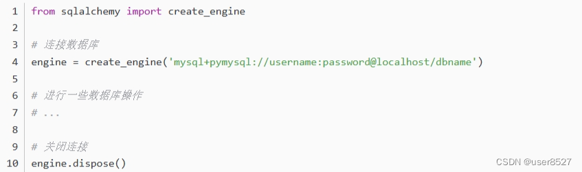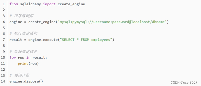 mysql:数据库类型;pymysql:MySQL数据库驱动;username:数据库用户名;password:数据库密码;localhost:数据库主机名;dbname:数据库名。-
