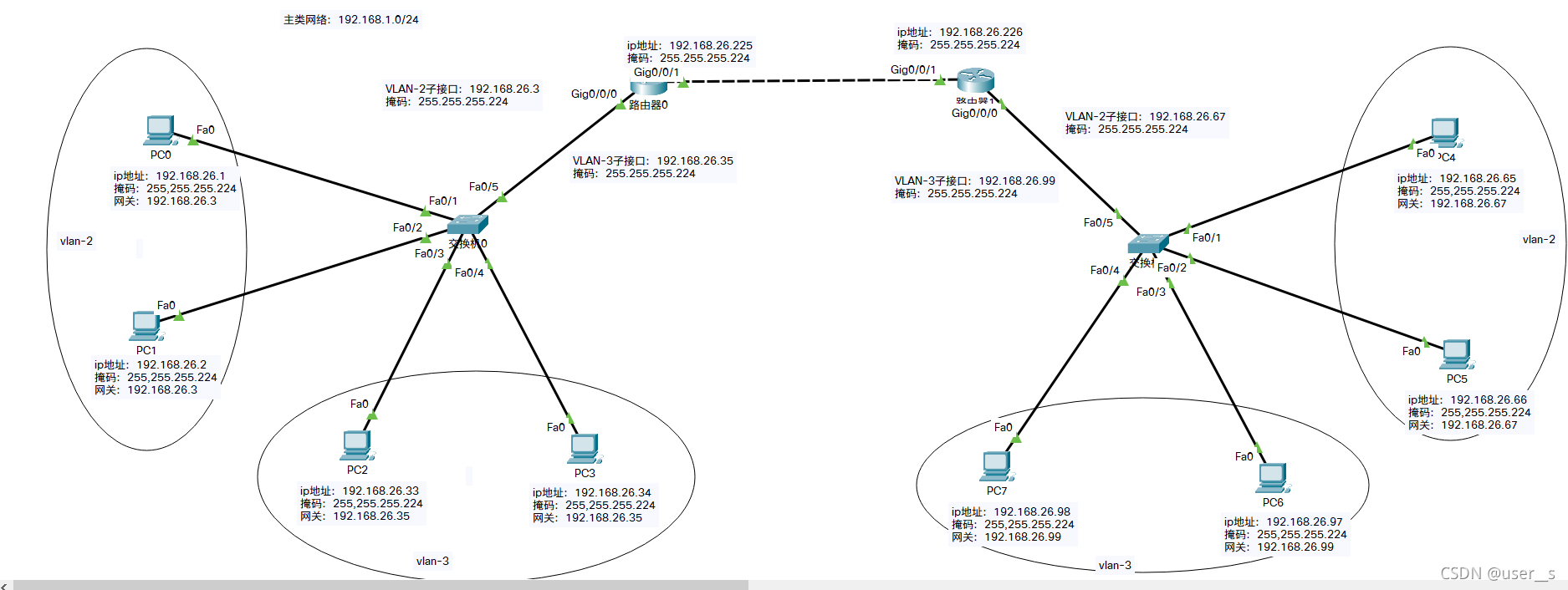 给各个PC机配置上自己的IP地址和子网掩码,这里放上我自己的网络表作为参照: