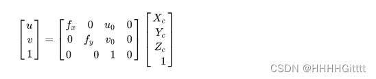Xc,Yc,Zc为为相机坐标系的点,u,v为像素坐标系的点。其关系为: