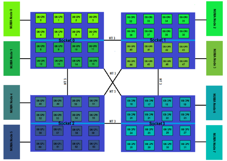 NUMA体系结构中多了Node的概念,这个概念其实是用来解决core的分组的问题,具体参见下图来理解(图中的OS CPU可以理解thread,那么core就没有在图中画出),从图中可以看出每个Socket里有两个node,共有4个socket,每个socket 2个node,每个node中有8个thread,总共4(Socket)× 2(Node)× 8 (4core × 2 Thread) = 64个thread。