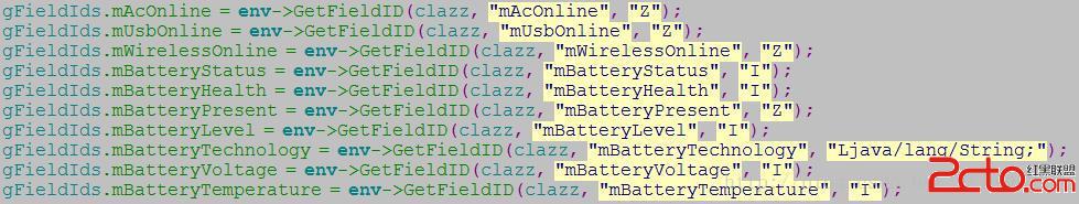 供上层BatteryService使用。另外,在这个文件中通过GetFieldID,得到BatteryService.java类中声明的电池属性ID,如下: