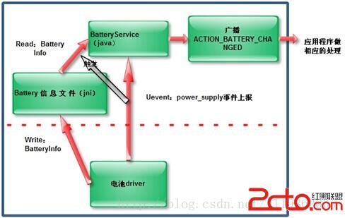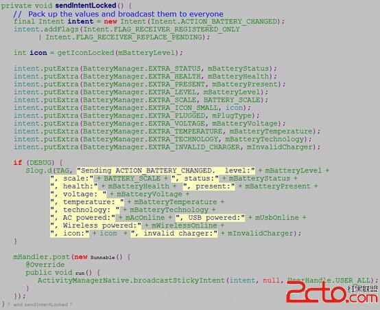 通过广播Intent.ACTION_BATTERY_CHANGED,将电池状态、电池电量、电池工艺等属性打包,发送给其它的使用者,也就是说,只要在app程序里监听了Intent.ACTION_BATTERY_CHANGED这个广播,就能获取到电池的各种状态属性!