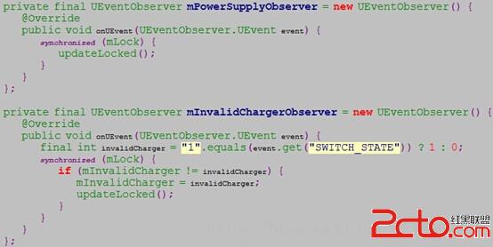 BatteryService实现了两个UEvenObserver mUEventObserver(如上代码所示)。uevent是Linux 内核用来向用户空间主动上报事件的机制,对于JAVA程序来说,只实现 UEventObserver的虚函数 onUEvent,然后注册即可。