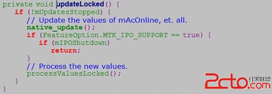 update读取sysfs文件做到同步取得电池信息,然后根据读到的状态更新BatteryService 的成员变量,并广播一个Intent来通知其它关注电源状态的组件。当kernel有power_supply事件上报时,mUEventObserver调用update()函数,然后update 调用native_update从sysfs中读取相关状态(com_android_server_BatteryService.cpp)。