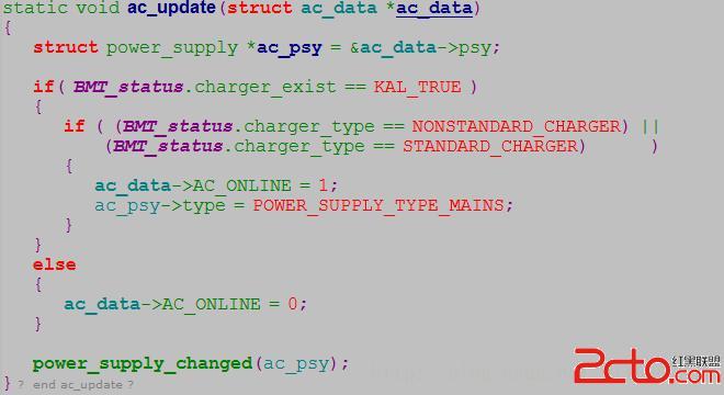该函数在power supply sysfs中show property的时候得到调用,而AC_ONLINE作为ac电源唯一的属性会在ac_update中得到更新: