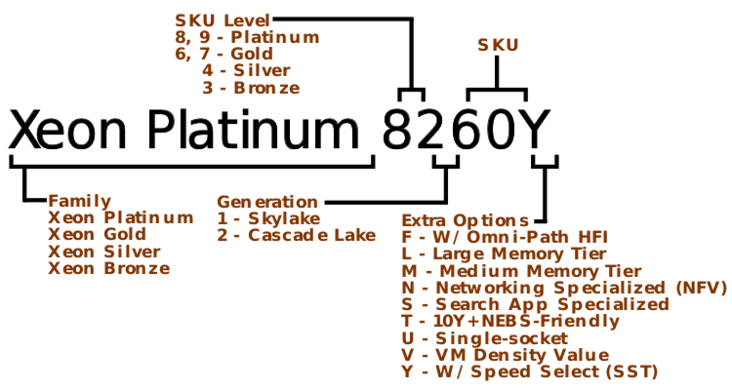 Intel Xeon Platinum 8269CY,阿里云使用的这一款处理器是阿里定制款,并不能在Intel的官方手册中查询到,不过我们可以通过下方Intel处理器的命名规则了解到不少的信息,它是一款这样的处理器:主频2.5GHz(睿频3.2GHz、最大睿频3.8GHz),26核心52线程(具备超线程技术),6通道DDR4-2933内存,最大配置内存1T,Cascade Lake微架构,48通道PCI-E 3.0,14nm光刻工艺,205W TDP。它是这一代至强处理器中性能比较强的型号了,最大支持8路部署。