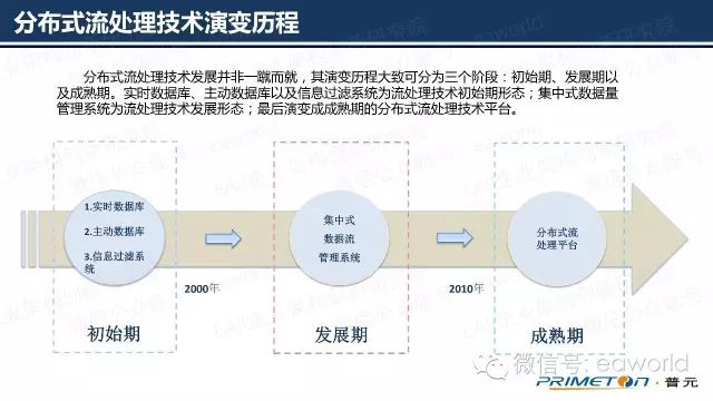 分布式流处理技术发展并非一蹴而就,其演变历程大致可分为三个阶段:初始期、发展期以及成熟期。实时数据库、主动数据库以及信息过滤系统为流处理技术初始期形态;集中式数据量管理系统为流处理技术发展形态;最后演变成成熟期的分布式流处理技术平台。