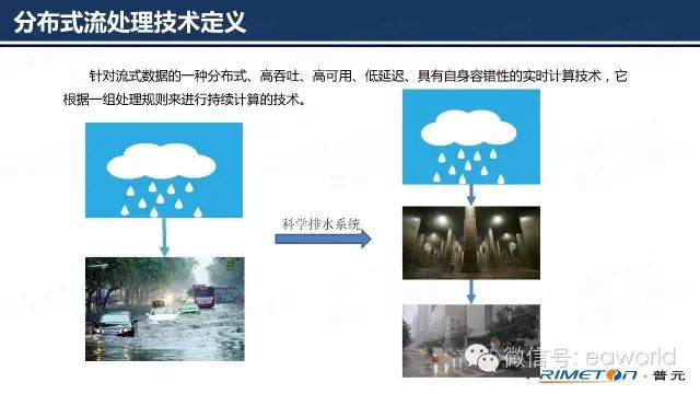 指针对流式数据的一种分布式、高吞吐、高可用、低延迟、具有自身容错性的实时计算技术,它根据一组处理规则来进行持续计算的技术。打个比方:相信大家对每年夏天的洪水灾害印象深刻,比如“故宫看海”,雨(数据)又大又急,雨水不能及时排出,将故宫变海,后借助科学排水系统(分布式流处理平台)解决。