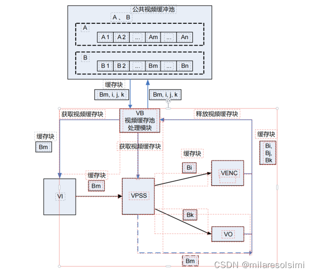 上图为典型的公共视频缓存池数据流图,所有视频输入通道都可以从这里获取视频缓存块,用于保存采集的图像。例如图中VI从缓存池中获取缓存块Bm并发送给VPSS,VPSS处理后再释放回公共视频缓存池(下面的虚线)。假设VPSS的工作模式是USER(该模式主要用于对同一通道图像进行多路编码的场景),则 VPSS 通道 0 从公共视频缓存池 B 中获取缓存块 Bi 作为输出图像缓存 buffer 发送给 VENC,VPSS 通道 1 从公共视频缓存池 B 中获取缓存块 Bk 作为输出图像缓存 buffer 发送给 VO,Bi 经 VENC 编码完之后释放回公共视频缓存池,Bk 经 VO 显示完之后释放回公共视频缓存池。不同类型的视频缓存池大小计算参考hi_buffer.h。