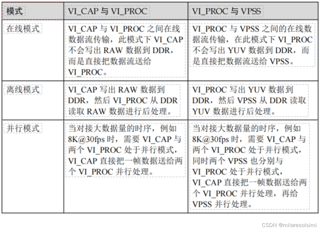 VI和VPSS各自的工作模式分为在线、离线、并行,不同工作模式说明如下: