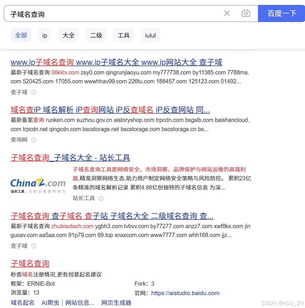 目前子域名搜集十分方便,你既可以使用ZoomEye等网站,也可以在百度上随意搜索子域名在线查询,便能得到许多在线网站。