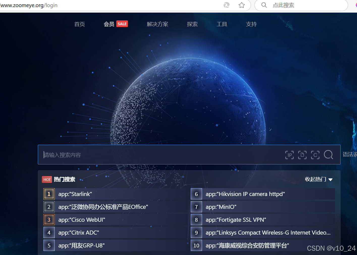 ZoomEye(https://www.zoomeye.org/)是一个专注于互联网设备和服务的搜索引擎,主要用于网络空间的安全研究和网络侦察。