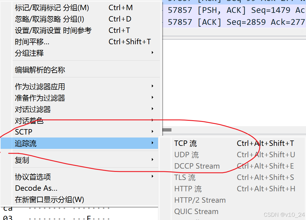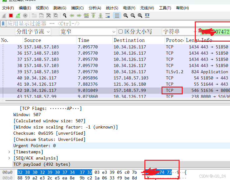 1.我们首先需要查询自己的手机ip和电脑ip,并确保他们在同一个内网当中。然后将wireshark打开并进行流量分析,按CTRL+F键对自己的QQ号进行关键字查询,如下图,我们发现含有我们qq账号关键字的流量都是TCP协议的。