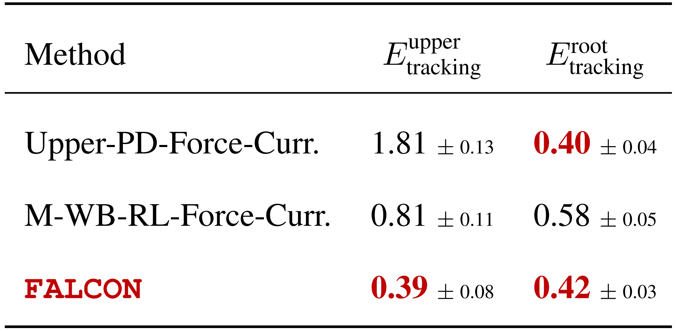 - (e) Monolithic-WB-RL-w/o-Force-Curr.:在先前设计 [11,15] 的基础上,使用与 FALCON 相同的目标指令训练单一智能体,但在训练过程中不施加任何力