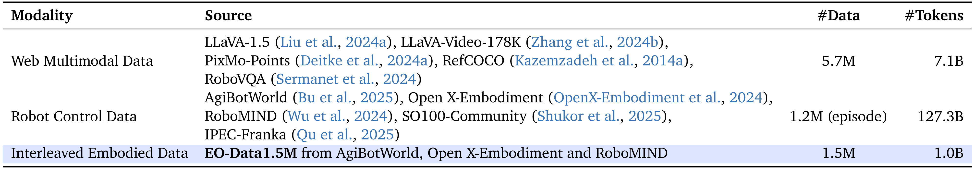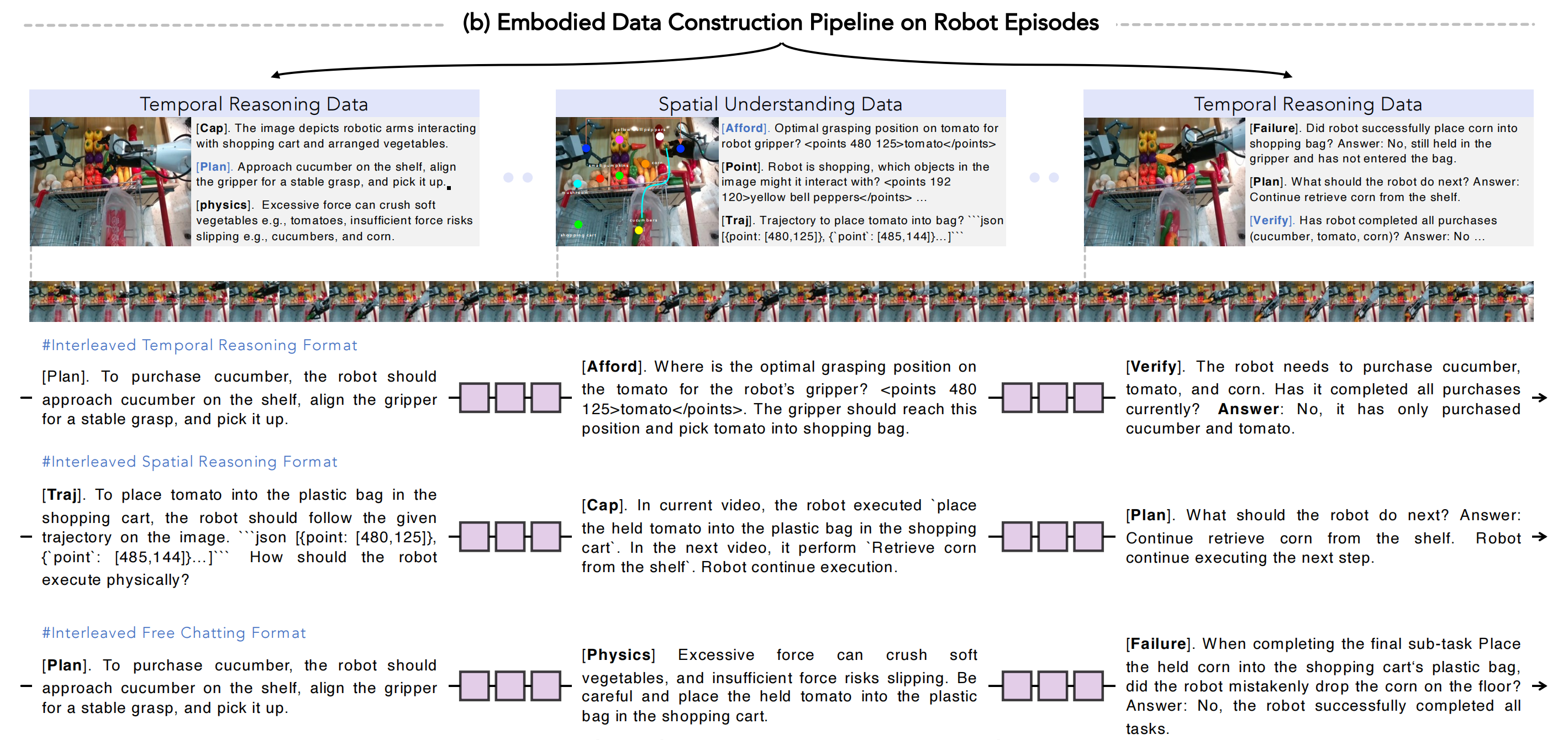 - 交错的视觉-文本-动作数据,将时空推理数据与机器人控制数据连接,用于学习具身交互中的多模态因果关系
