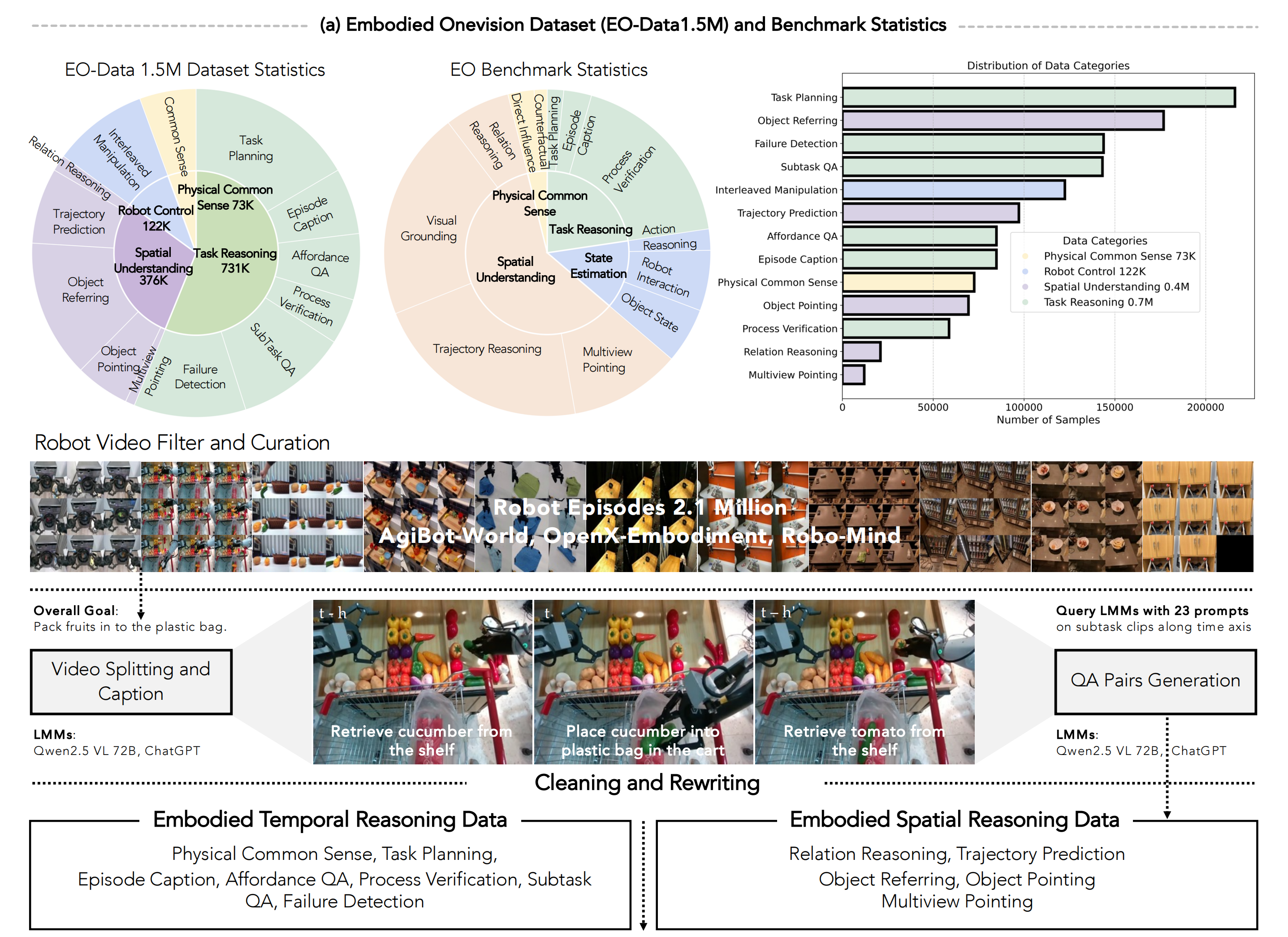 - 随后,利用VLMs和人工对真实机器人操作片段进行多样化的具身时空问答对标注,涵盖物理常识理解、任务规划、物体定位、可供性指示以及多视角对应等内容。这些标注使模型能够学习物理世界中细粒度的几何与时空表示
