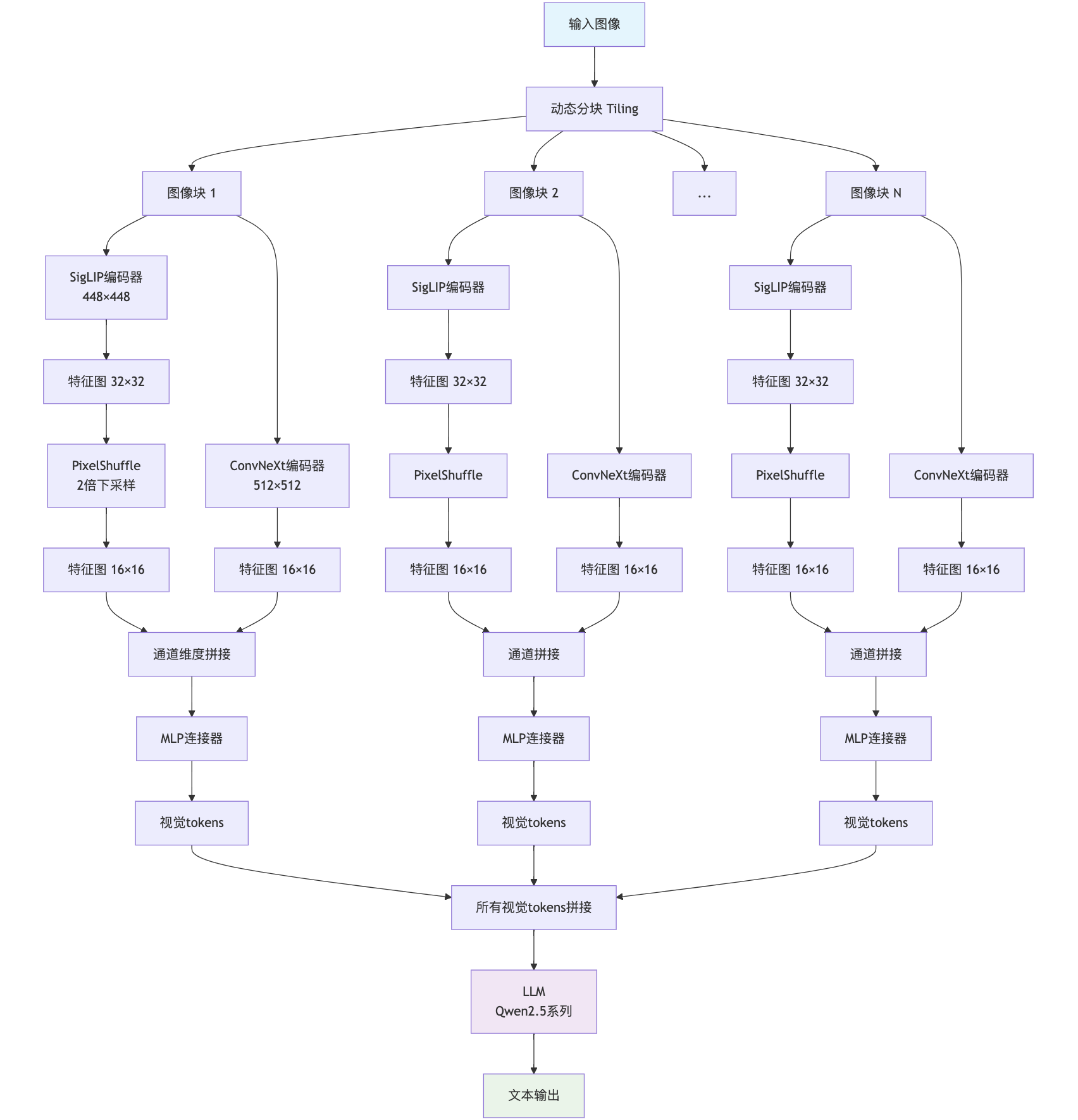 SigLIP分支:调整至448x448 -> SigLIP -> 特征图(32x32)-> PixelShuffle下采样2倍 -> 16x16