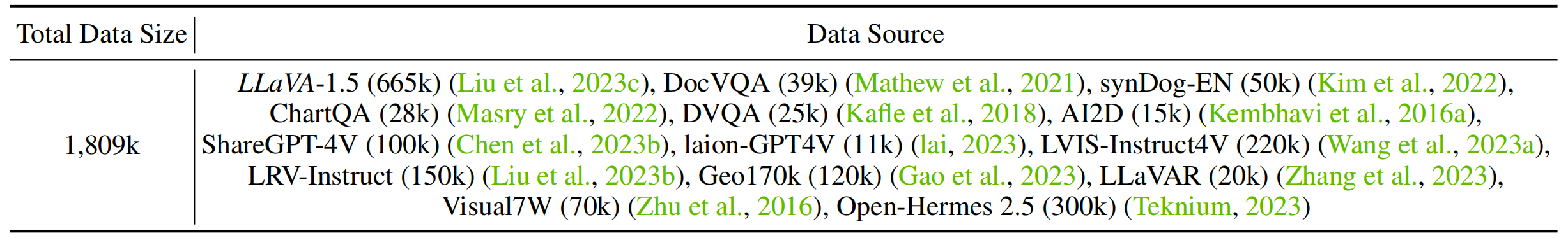 但在本工作中,作者将所有用于视觉指令的数据源添加到Stage-1.5,同时引入如表2b所示的其他几个数据集