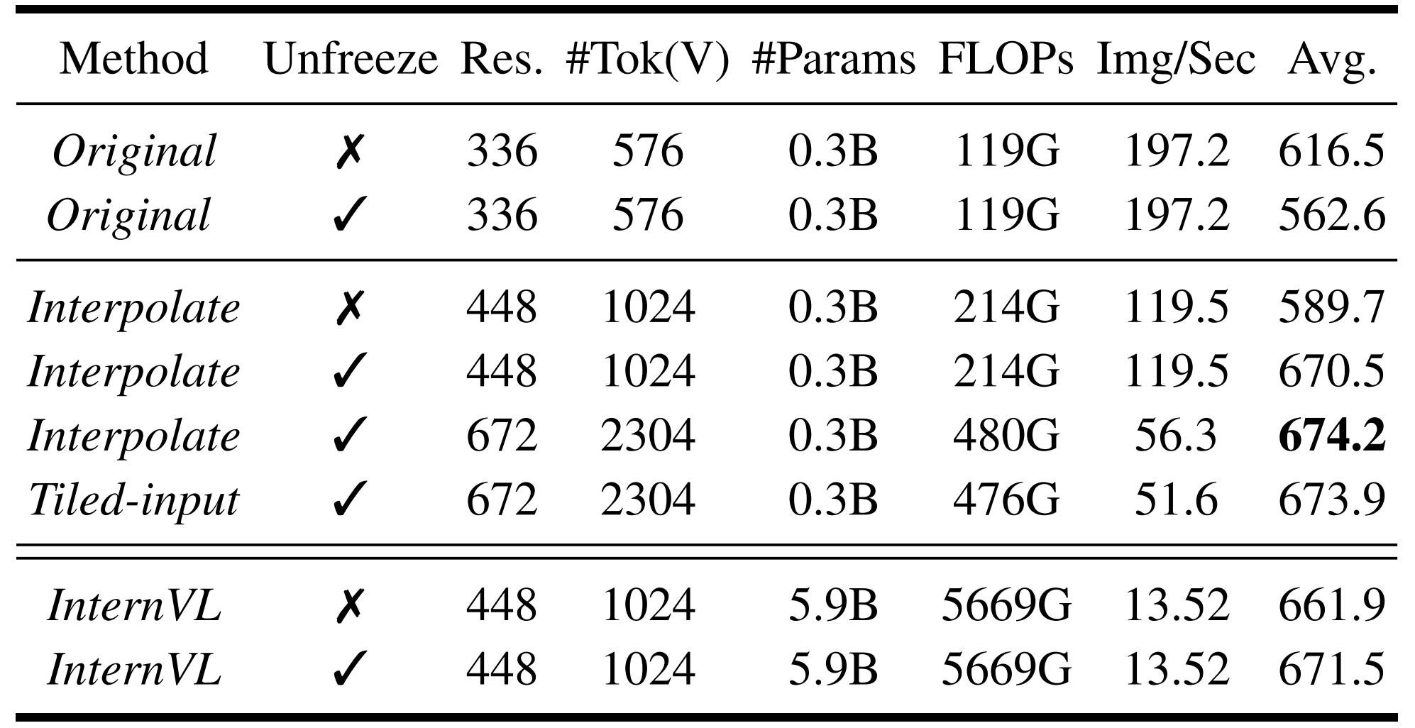 - 将CLIP 编码器插值以适应输入尺寸为448 × 448 在效率和性能之间提供了良好的平衡,其性能仅略低于672 × 672 版本,但所需token 数量不到一半