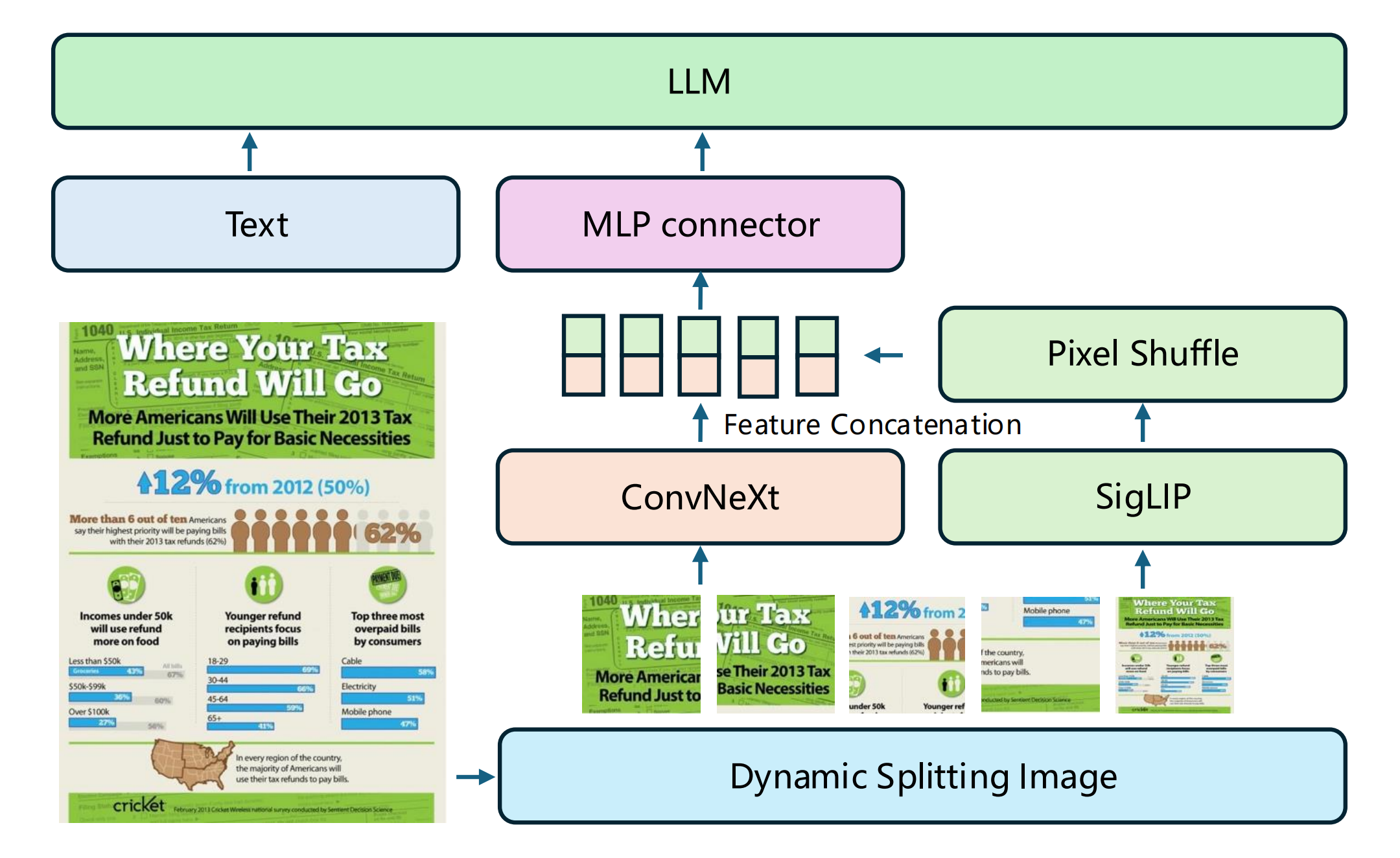 同时输入两个视觉编码器(SigLIP和ConvNeXt),每个编码器会相应的调整图像块的大小至所需输入尺寸