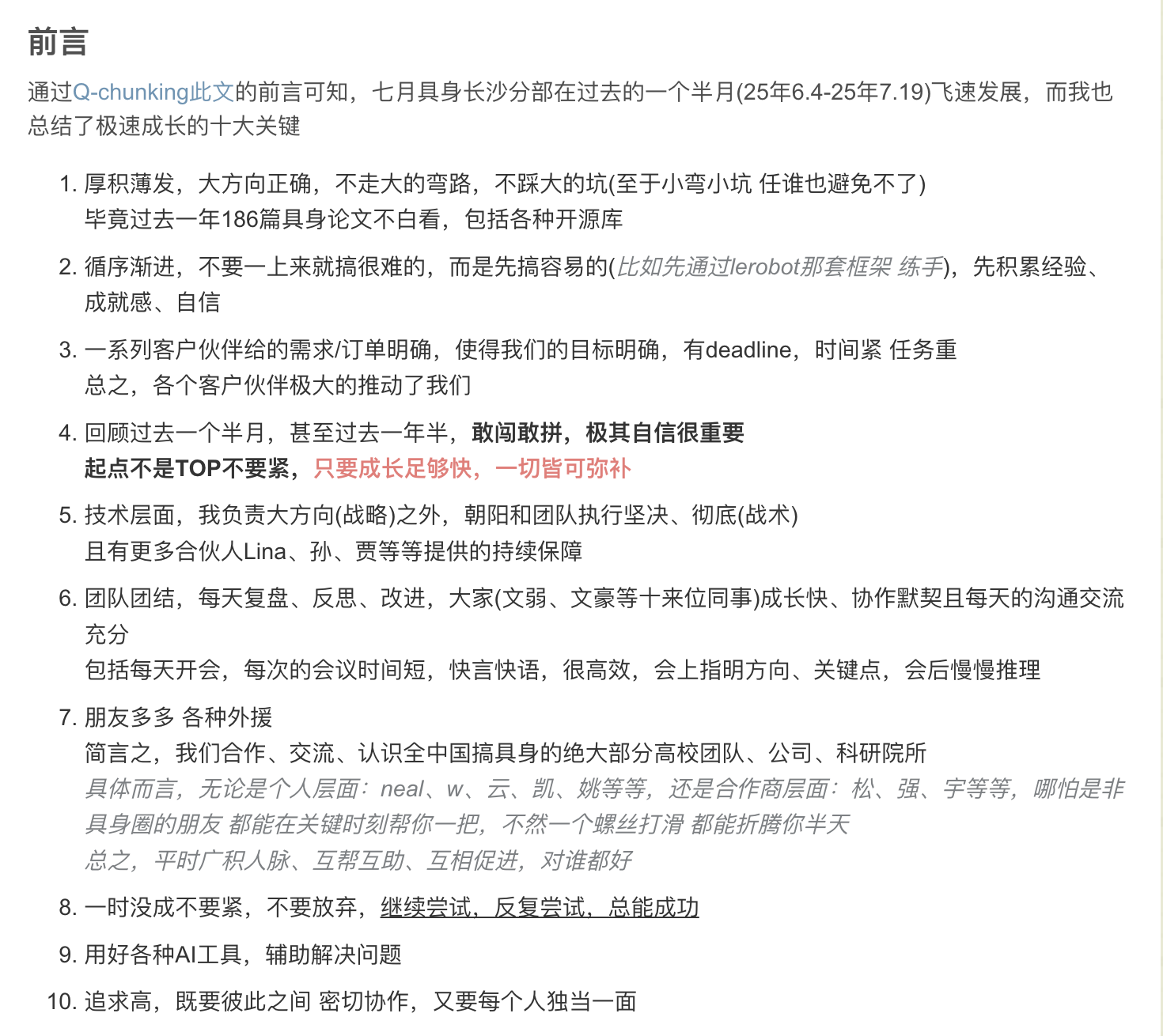 - 我们之前确实有了很多的积累,包括我个人过去一年看了200多篇具身论文,在经验和人脉上 可以让团队少走太多弯路、提升足够多的效率、效果