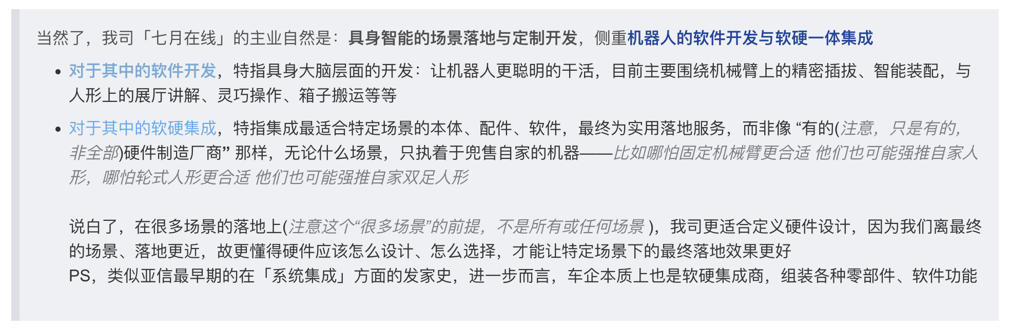 - 然,具身不一样,本体厂商忙于运控,学校侧重科研,互联网大厂还处于具身布局早期,而我司完全可以用1-2年的时间完成积累,加速推动科研到实际生产力的尽快落地
