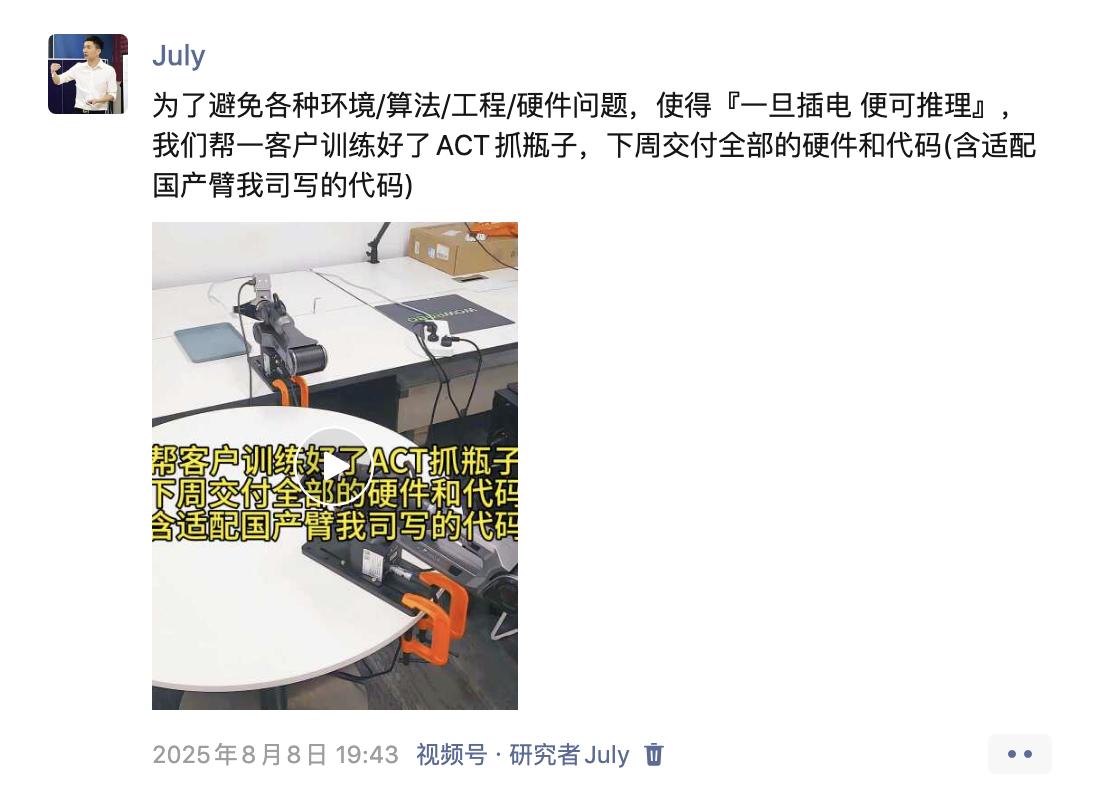 - 8.8,为了避免各种环境/算法/工程/硬件问题,使得『一旦插电 便可推理』,我们帮一客户训练好了ACT抓瓶子,下周交付全部的硬件和代码(含适配国产臂我司写的代码)