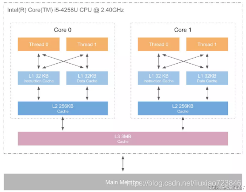 在多核CPU的机器中,进程的运行在初始状态下,未经过可以设置的情况下,会被调度到不同CPU核心执行,由于CPU的硬件结构分为L1 L2 L3缓存,如图所示