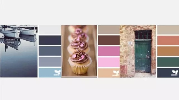 这种色彩搭配通常都非常的有鲜亮活泼,但尽量不要用三个大纯色的搭配,要用它们降纯后的的灰度色,然后也是要有一个主次关系,一个颜色为主,另两个为辅,如图就是橙、紫、绿;红、黄、蓝等。