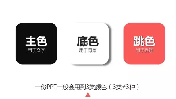 一份PPT通常包含三类颜色,主色,底色,和跳色。主色通常用于文字,底色用于背景,跳色用于强调,主要为色块,线条。