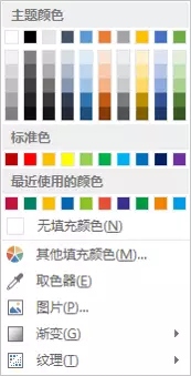 第一种是PPT本身自带了一套色彩主题,其中包括主题颜色、标准色、最近使用的颜色、其他填充颜色、取色器等。基本上直接根据主题颜色就能够做出不错的PPT。