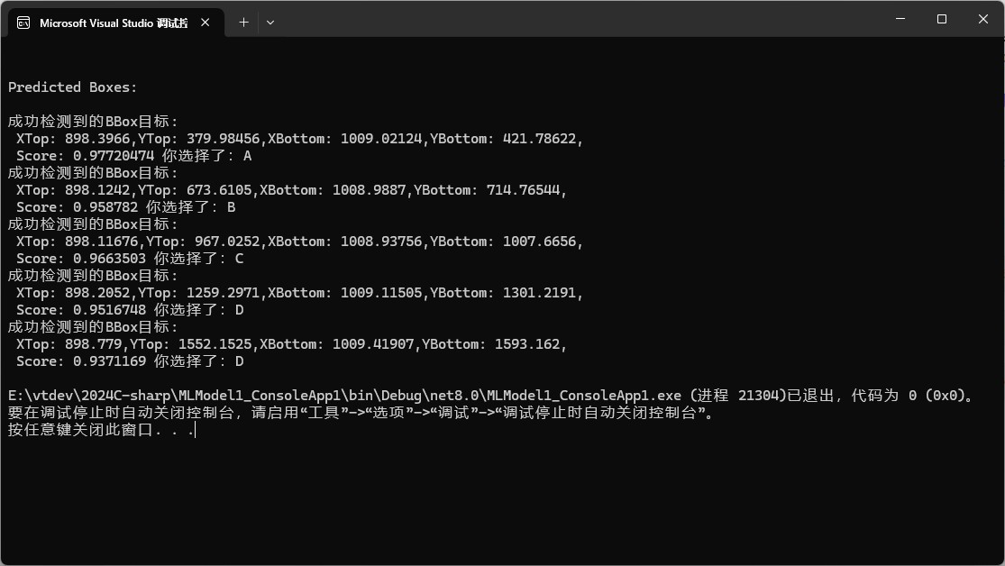 Console.WriteLine($"成功检测到的BBox目标:\n XTop: {item.Box.XTop},YTop: {item.Box.YTop},XBottom: {item.Box.XBottom},YBottom: {item.Box.YBottom}, \n Score: {item.Score} 你选择了:{item.Label}");
