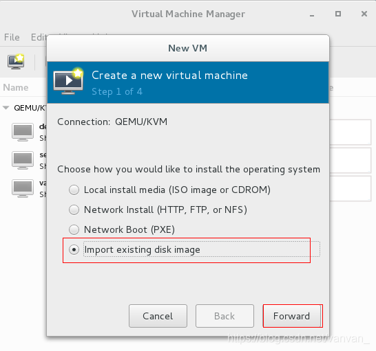 (1)通过virt-manager命令进入管理器,file按钮新建虚拟机,选中最后一项导入刚才新建快照