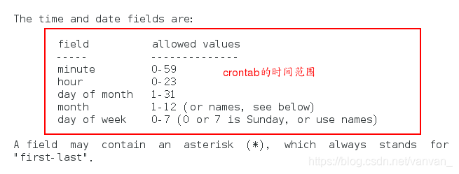0-59 0-23 1-31 1-12 0-6 command (取值范围,0表示周日一般一行对应一个任务)