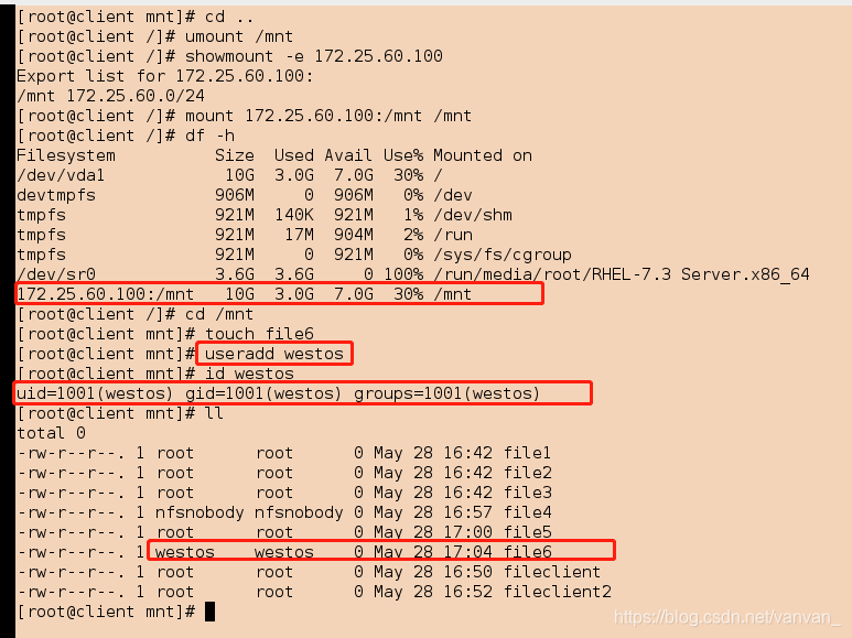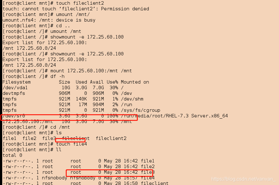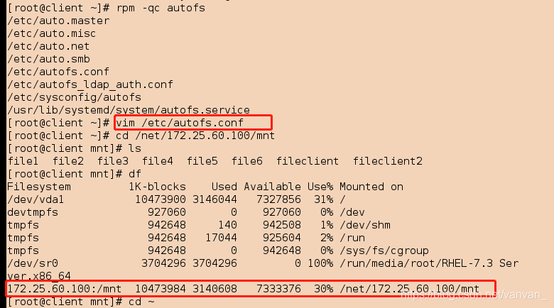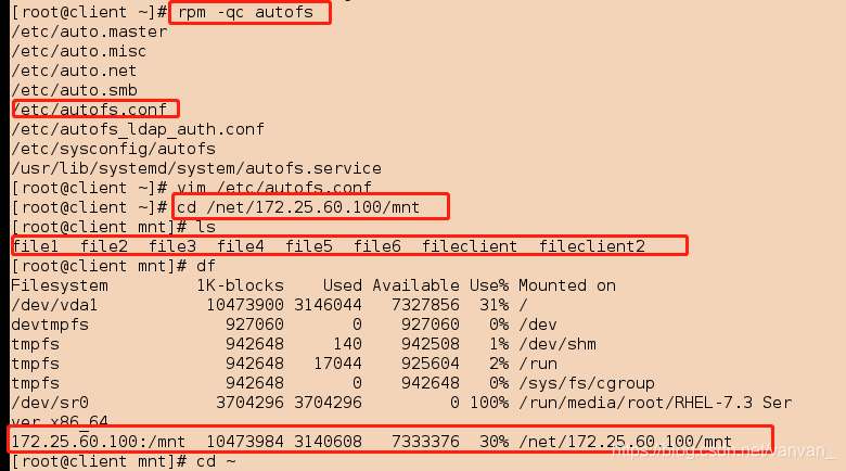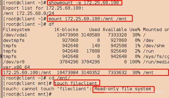 mount 172.25.60.100:/mnt /mnt 现在操作的就是服务器的/mnt目录,直接对服务器该目录进行操作
