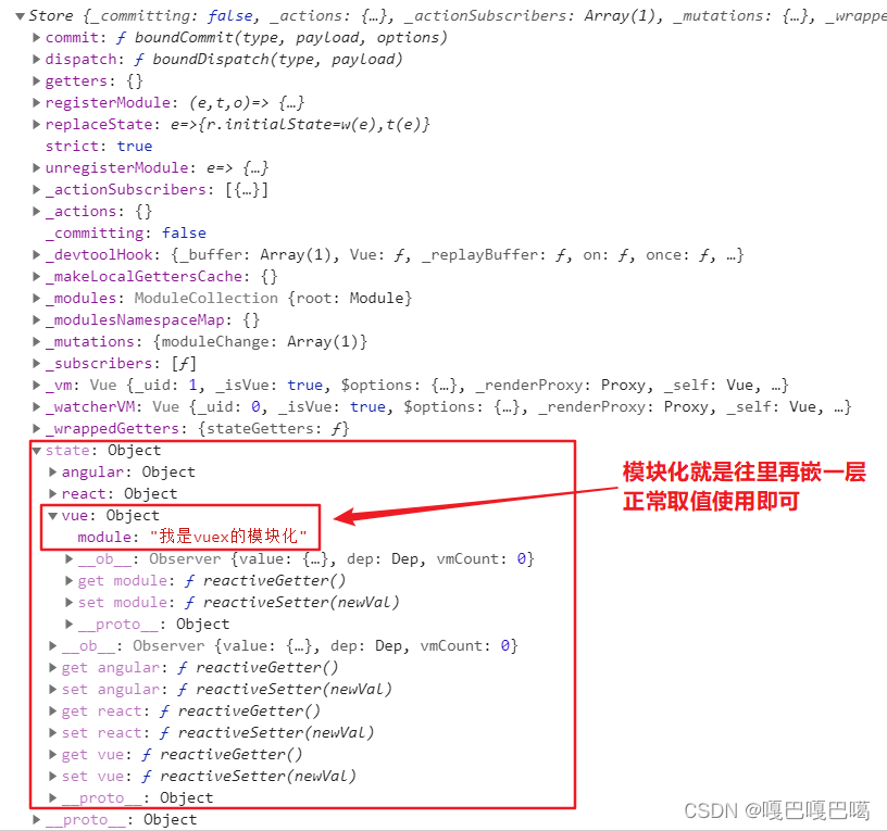 <template> <div> <h2>{{ msg }}</h2> <el-button @click="moduleChange">模块化修改值</el-button> </div> </template> <script> export default { name: "CodeVue", computed: { ...mapState({ msg:state=>state.vue.module }) }, methods: { moduleChange(){ // 注意,直接提交对应模块的方法即可,commit会自动找到对应vuex下的方法 this.$store.commit('moduleChange','我是参数') } }, }; </script> -