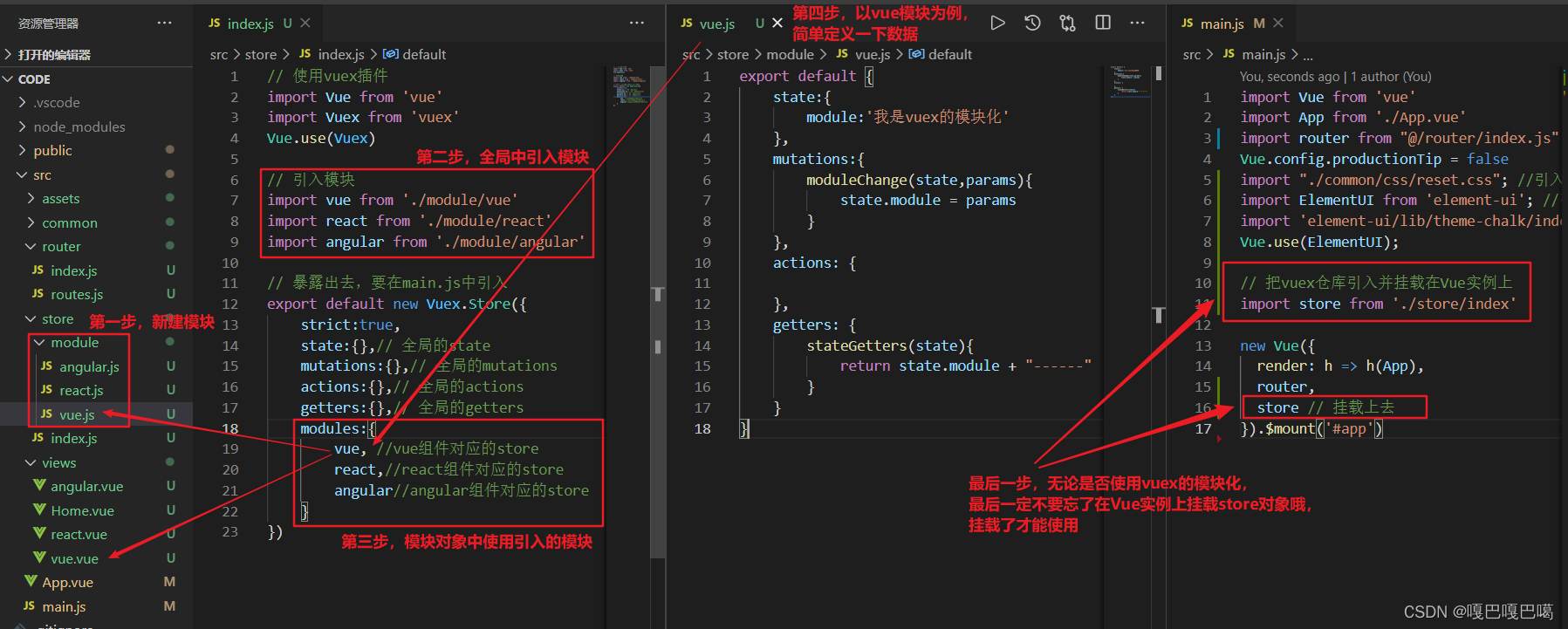提起模块化,思想还是那句话,大而化小,便于管理。很多语言都有模块化的应用,vuex也是一样。试想,如果所有的状态数据都写在一起,看着容易眼花缭乱,不便于管理。所以尤大老对于vuex的设计中,就做了模块化module的处理