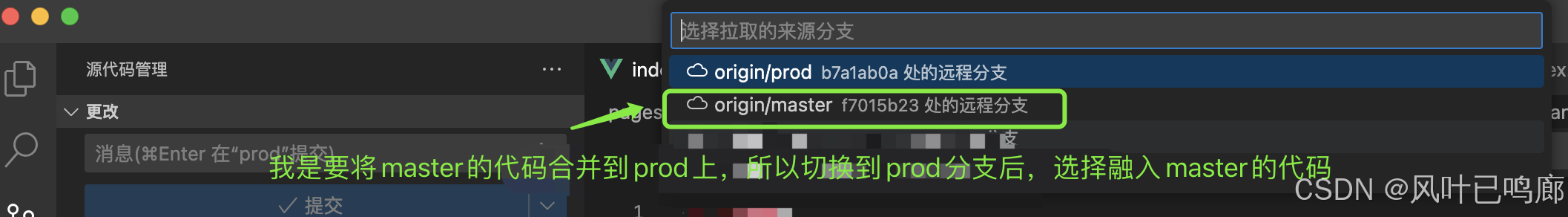 目标分支的最新代码拉取成功后,选择要合并哪一个分支的代码到目标分支: