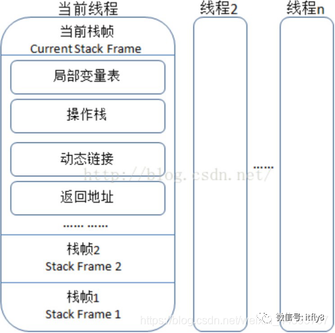 是描述java方法执行的内存模型,每个方法在执行的同时都会创建一个栈帧(Stack Frame)用于存储局部变量表、操作数栈、动态链接、方法出口等信息。每一个方法从调用直至执行完成的过程,就对应着一个栈帧在虚拟机栈中入栈到出栈的过程。 栈帧( Frame)是用来存储数据和部分过程结果的数据结构,同时也被用来处理动态链接(Dynamic Linking)、 方法返回值和异常分派( Dispatch Exception)。栈帧随着方法调用而创建,随着方法结束而销毁——无论方法是正常完成还是异常完成(抛出了在方法内未被捕获的异常)都算作方法结束。
