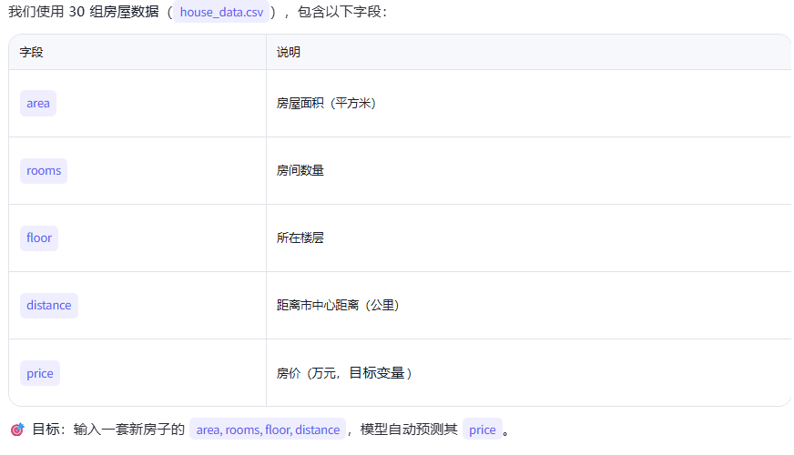 数据:house_data.csv 中表格数据(打开记事本或 VS Code,粘贴 → 另存为 house_data.csv):