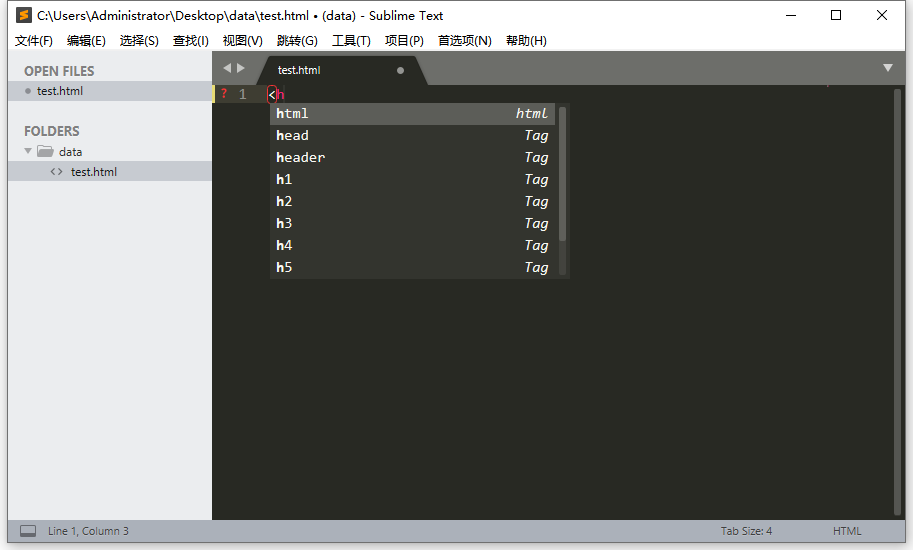 当我们写上<h,软件会弹出所有的可能代码,我们回车即可变成下图
