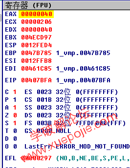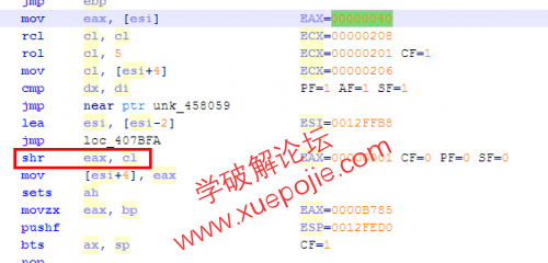 第二次对ebx(密钥)直接赋值的地方与第一次(进入虚拟机)相差很远,我们再以此为基准向上搜索00000040(对应的是ZF标志位为1的EFLAGS)。