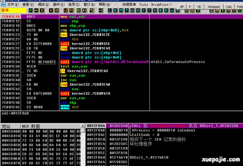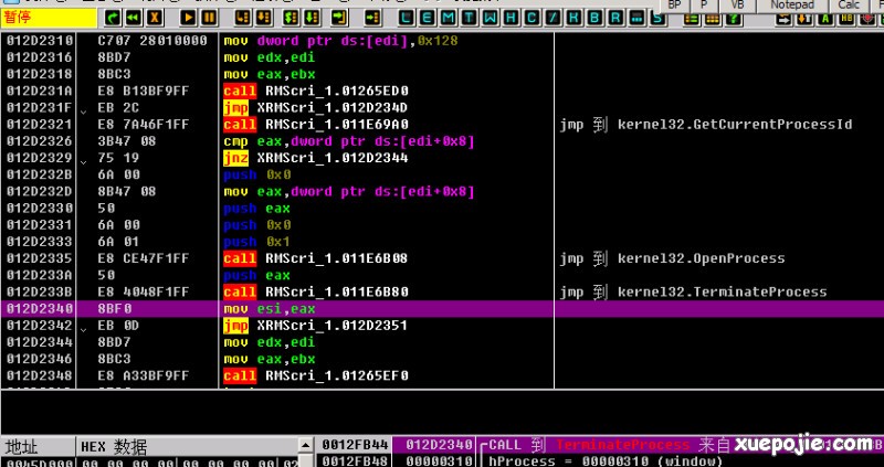 0012FB44 012D2340 /CALL 到 TerminateProcess 来自 RMScri_1.012D233B