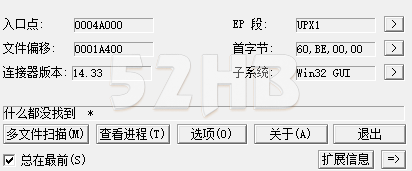 2、查壳,如图,下面显示什么都没找到,右上角EP段显示UPX1,感到应该是peid版本问题,没关系就当是upx壳。