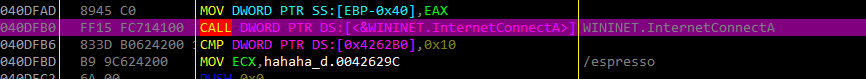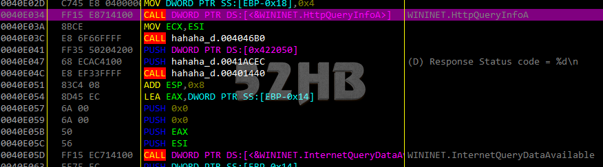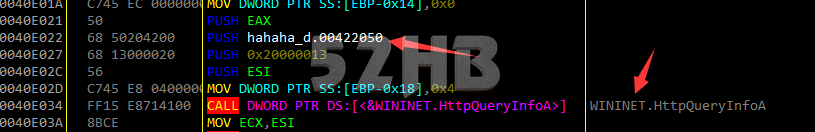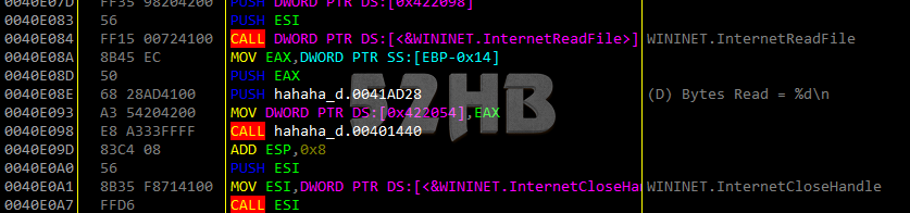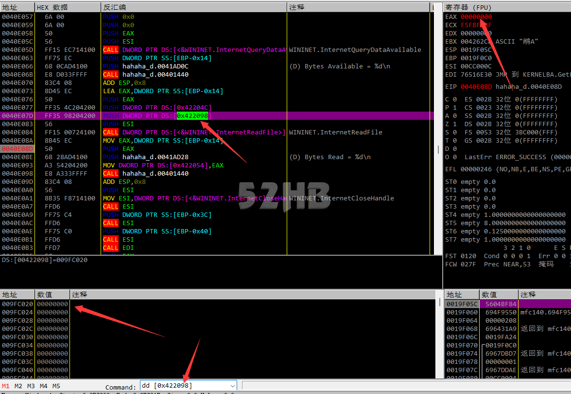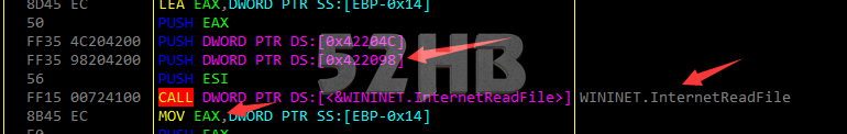 这里,读取了传回来的文件,存到内存[0x422098]里面,同时把返回的长度赋值给了EAX