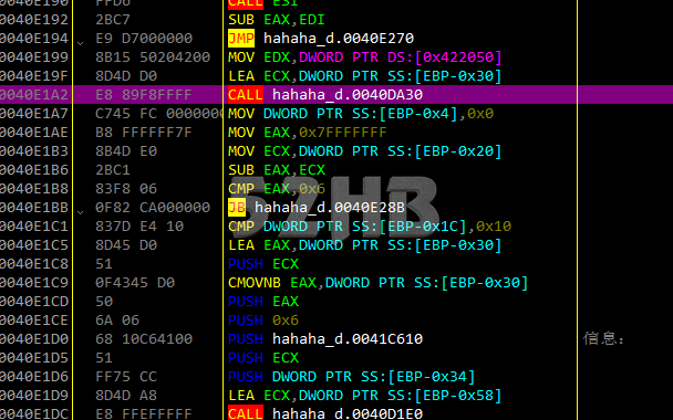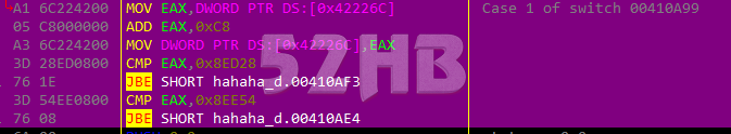 用EAX 比较,前面ADD EAX,0xC8 不断的给eax增加值0xC8(十进制的200),eax超过0x8ED28或0x8EE54就会退出程序。
