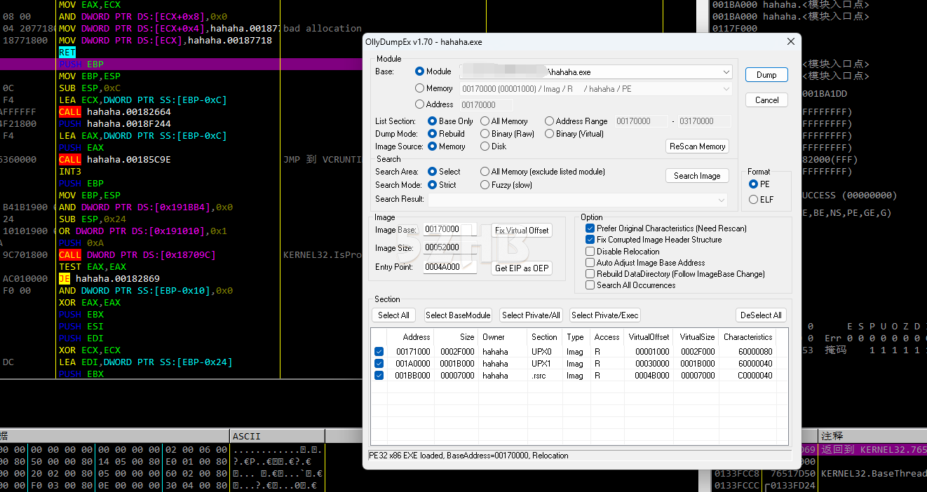 5、鼠标右键断下的地方,点跟随(或者直接键盘 enter),就来到了新的区域。为了确定是不是,右键汇编区域,中文搜索,确实有很多和这个软件相关的字符串,以及登录失败这些提示(涉及软件信息,这个我就不截图了),确定刚才跳转进入的地方就是正确的。返回之后,右键 选择 dump process 类似的字样,界面看不太懂,根据之前所了解的是有什么修复,但是界面默认选择了一些,先不管无脑下一步保存,得到了新的exe。