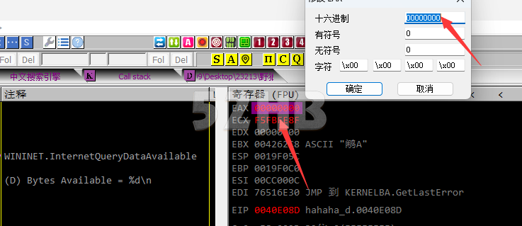 接着db 到存数据的地址,手动输入数据 -- 但在这里有坑,OD里面一次输入长度不够,手动要输超级久,于是又找了个申请内存的工具--被杀毒杀掉了,懒得找,工具我就不贴图了