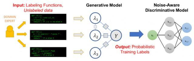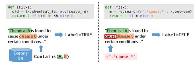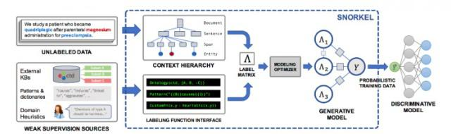 对于从科学文献中提取出某种「化学——疾病」关系的任务来说,他们可能还没有规模足够大的标注训练数据集来完成这项任务。然而,在生物医学领域,存在着丰富的知识本体、词典等资源,其中包括各种化学与疾病名称的知识本体、各种类型的已知化学——疾病关系的数据库等,研究人员可以利用这些资源来为他们的任务提供弱监督。此外,他们还可以与生物医学合作者一起提出一系列针对于特定任务的启发式、正则表达式模式、经验法则和负标签生成策略。