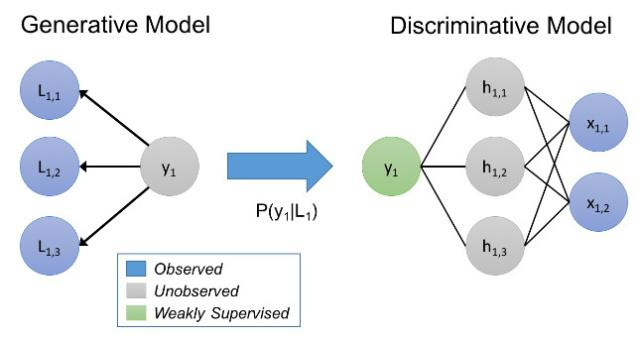 在斯坦福 AI 实验室的方法中,他们认为标注函数隐式地描述了一个生成模型。快速回顾一下:给定数据点 x,想要预测的未知标签 y,他们在判别方法中直接对 P(y|x) 建模,在生成方法中则对 P(x,y) = P(x|y)P(y) 建模。在本例,他们对标注训练集的过程 P(L,y) 建模,其中 L 是由对象 x 的标注函数生成的标签,y 是相应的 (未知的) 真值标签。通过学习生成模型,并直接估计 P(L|y),他们本质上是在根据它们如何重合并冲突来学习标注函数的相对准确性 (要注意地是,本例中不需要知道 y!)